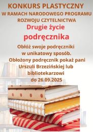 Zapraszamy do udziału w konkursie "Drugie życie podręcznika". Zadaniem konkursowym jest obłożyć podręczniki w unikatowy sposób. Następnie należy pokazać obłożony podręcznik pani Uli Brzezińskiej lub bibliotekarzowi (Katarzyna Stawicka), które zrobią jego zdjęcie. Prace przynosimy do 26 września. Wyniki zostaną ogłoszone 13 października.